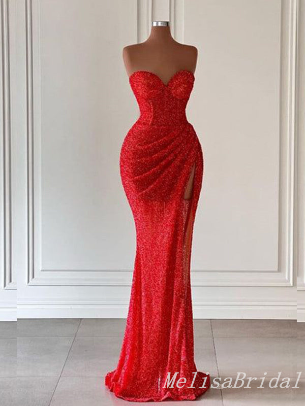 Red Strapless Mermaid Sweetheart Evening Gown Long Evening Party Prom Dresses with Side Slit,MB832